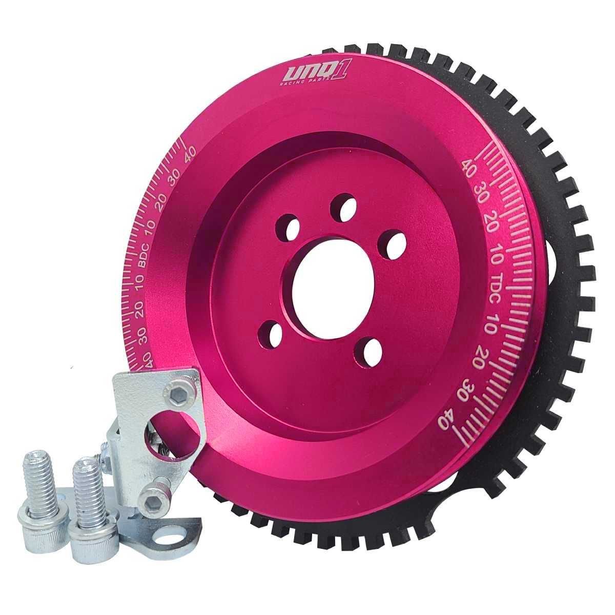 A RODA FONICA UNIQUE1 CONSISTE DE UMA POLIA DE ALUMÍNIO 6061 T6 COM ACABAMENTO ANODZADO, UMA ENGRENAGEM DE AÇO 1020 DISPONDO DE 60-2 DENTES CORTADOS A LASER E UM SUPORTE DO SENSOR DE ROTAÇÃO.