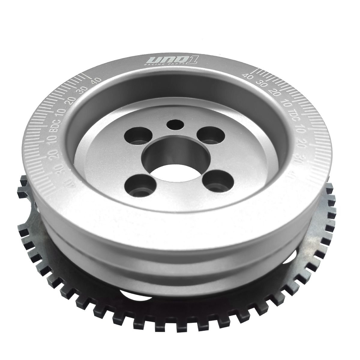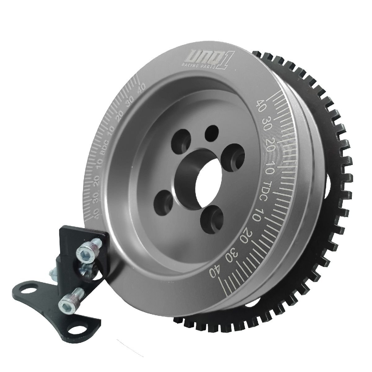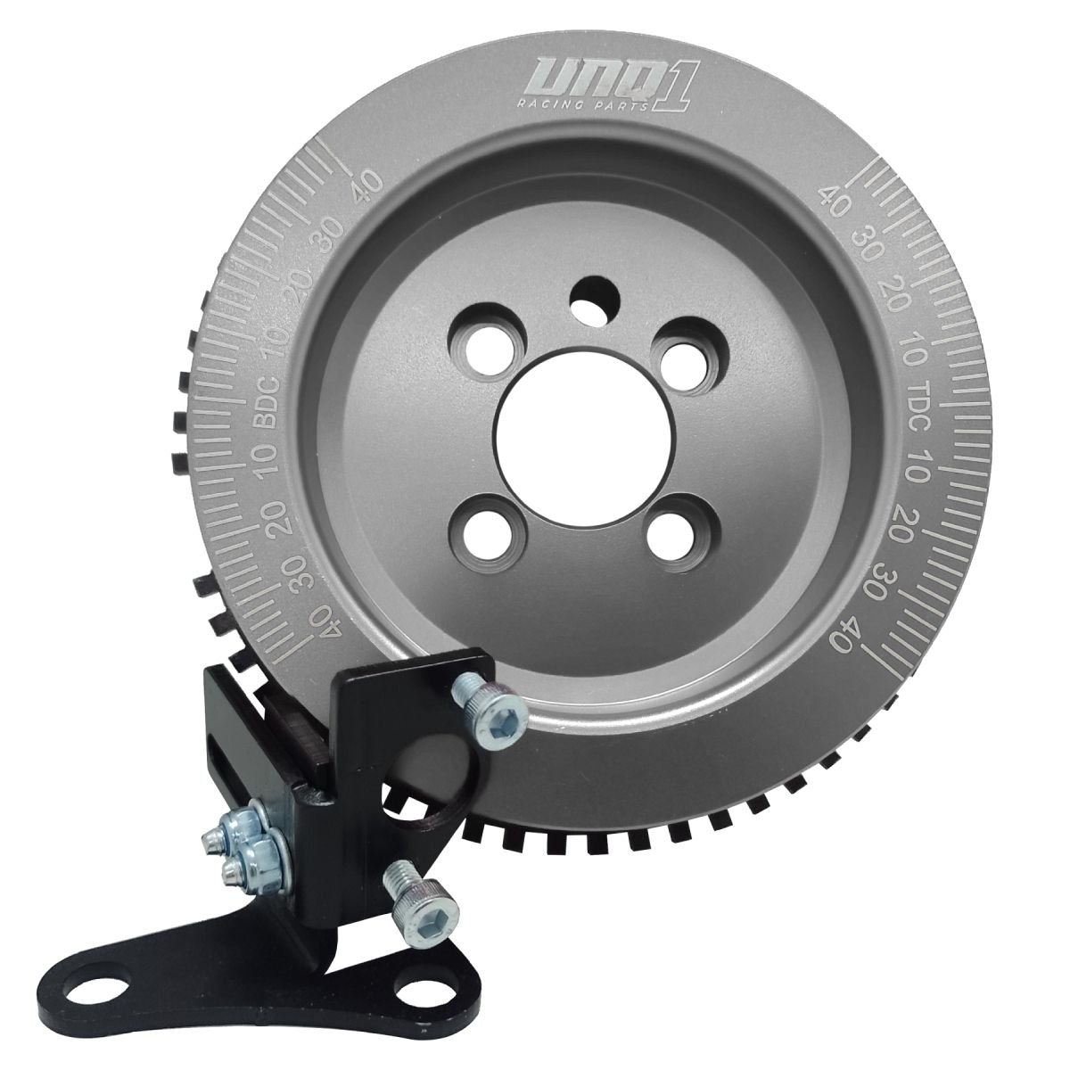 A RODA FONICA UNIQUE1 CONSISTE DE UMA POLIA DE ALUMÍNIO 6061 T6 COM 125MM DE DIÂMETRO, DOIS CANAIS PARA CORREIAS SIMPLES V, ACABAMENTO ANODZADO E GRADUAÇÃO GRAVADA A LASER; UMA ENGRENAGEM DE AÇO 1020 DISPONDO DE 60-2 DENTES CORTADOS A LASER E UM SUPORTE DO SENSOR DE ROTAÇÃO EM AÇO.