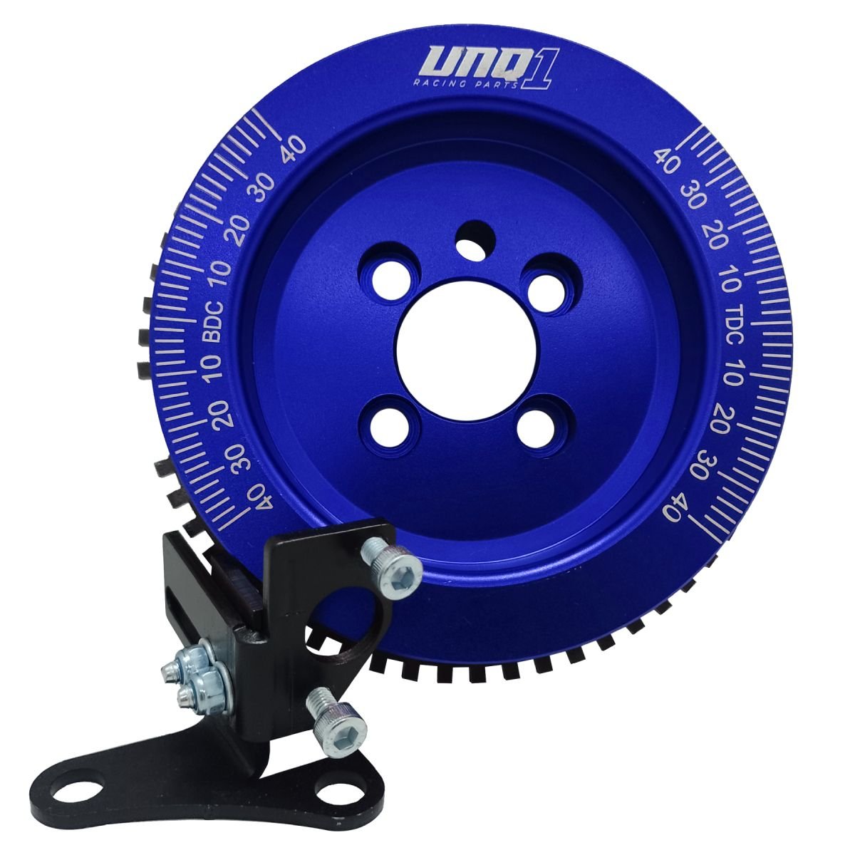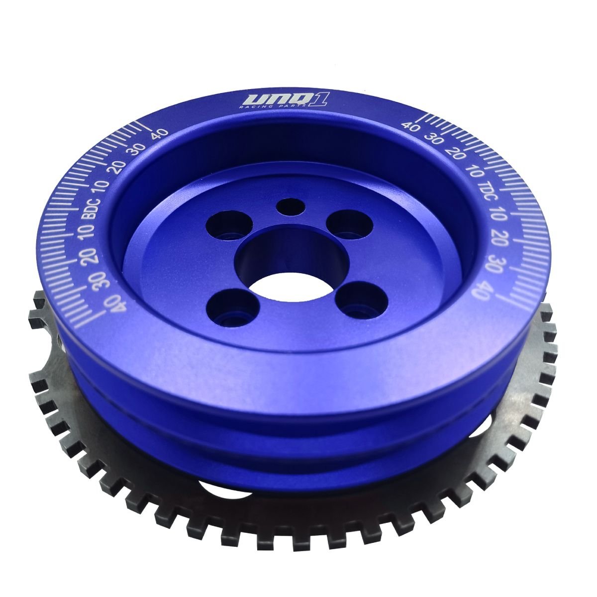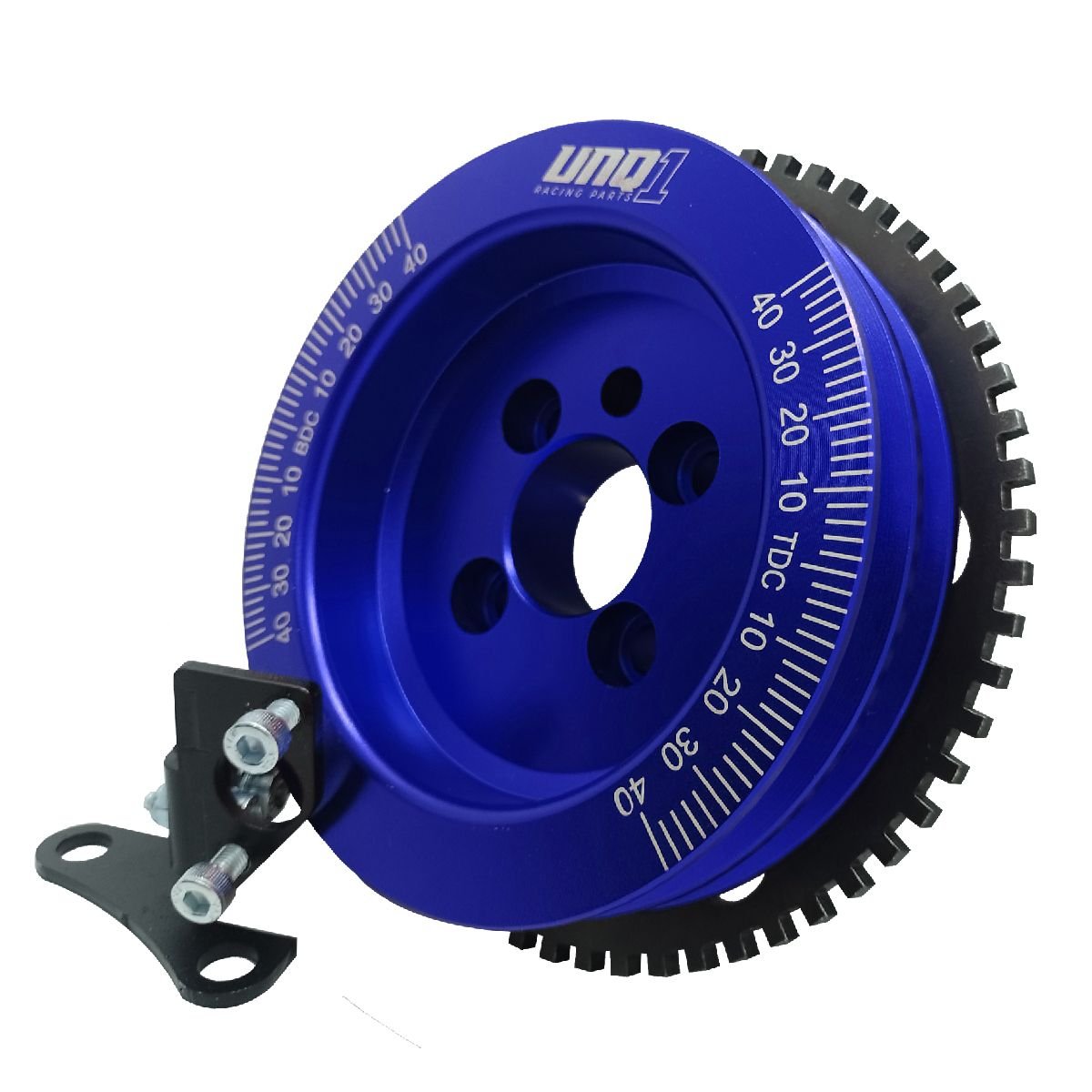 A RODA FONICA UNIQUE1 CONSISTE DE UMA POLIA DE ALUMÍNIO 6061 T6 COM 125MM DE DIÂMETRO, DOIS CANAIS PARA CORREIAS SIMPLES V, ACABAMENTO ANODZADO E GRADUAÇÃO GRAVADA A LASER; UMA ENGRENAGEM DE AÇO 1020 DISPONDO DE 60-2 DENTES CORTADOS A LASER E UM SUPORTE DO SENSOR DE ROTAÇÃO EM AÇO.