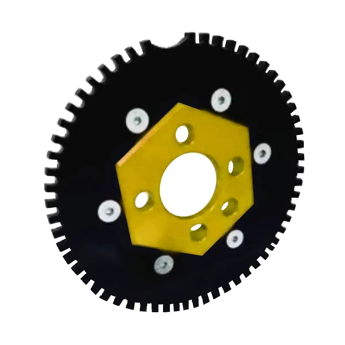POLIA DA RODA FONICA FABRICADA EM ALUMÍNIO 6061 T6 COM 100MM DE DIÂMETRO, ACABAMENTO ANODZADO, GRADUAÇÃO E ACOPLAMENTO NA ENGRENAGEM SEXTAVADO; ENGRENAGEM FABRICADA EM AÇO 1021 DISPONDO DE 60-2 DENTES DORTADOS A LASER E SUPORTE DO SENSOR DE ROTAÇÃO EM AÇO.