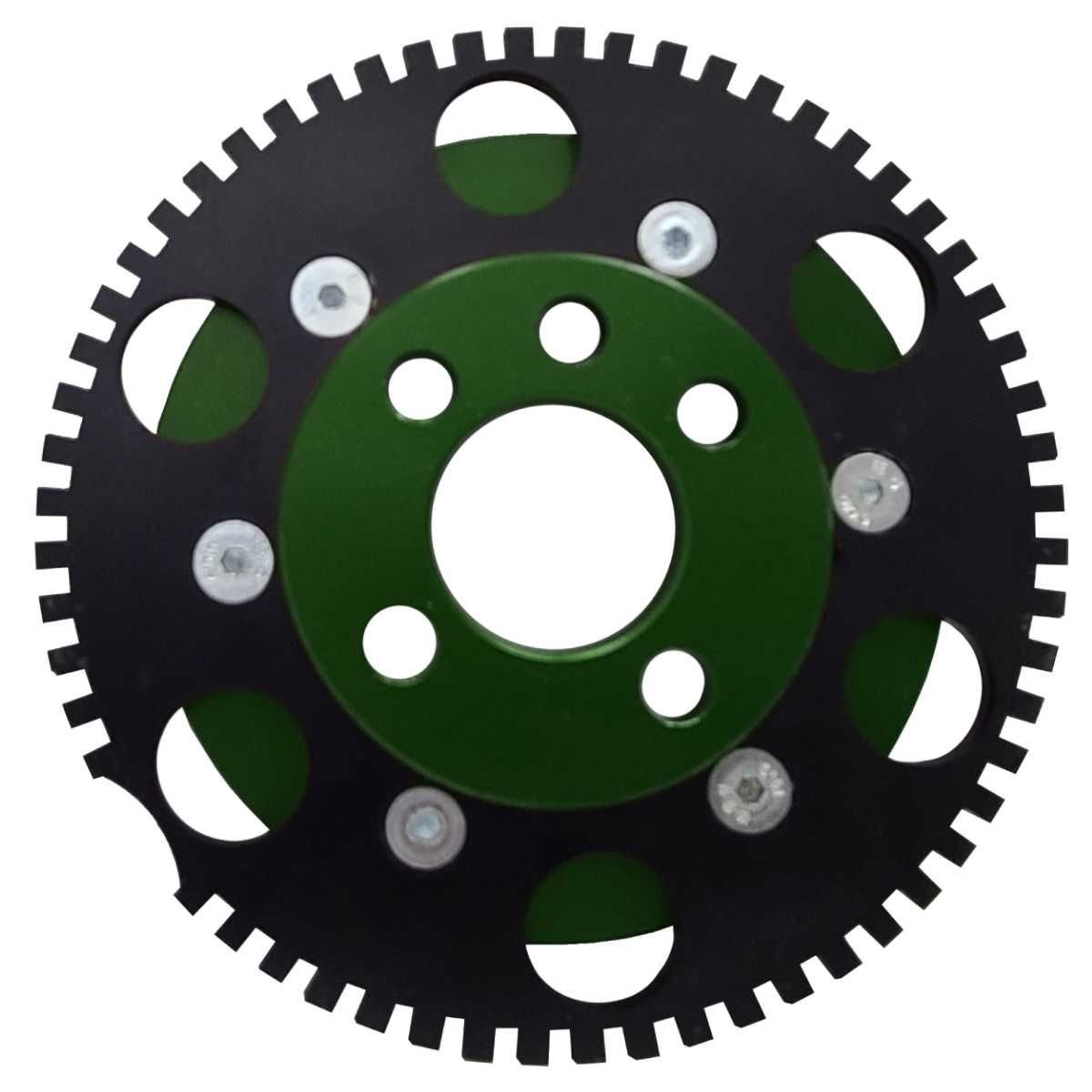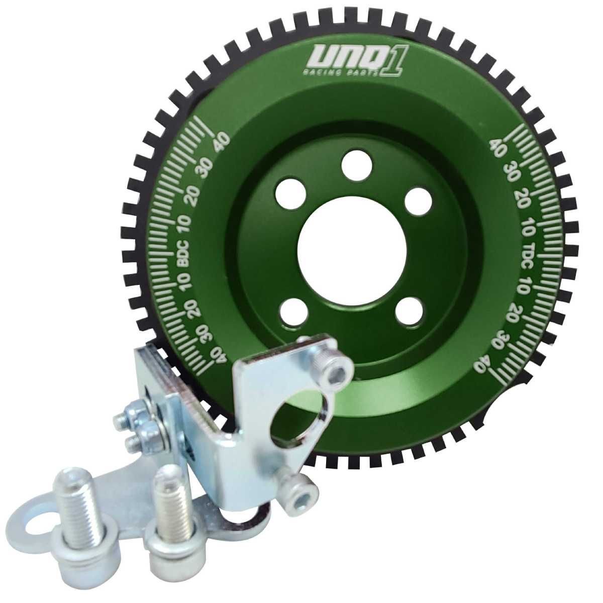 A RODA FONICA UNIQUE1 CONSISTE DE UMA POLIA DE ALUMÍNIO 6061 T6 COM 100MM DE DIÂMETRO ANODAZDA E GRADUAÇÃO FUNCIONAL; UMA ENGRENAGEM DE AÇO 1020 DISPONDO DE 60-2 DENTES CORTDOAS A LASER E UM SUPORTE DO SENSOR DE ROTAÇÃO EM AÇO.