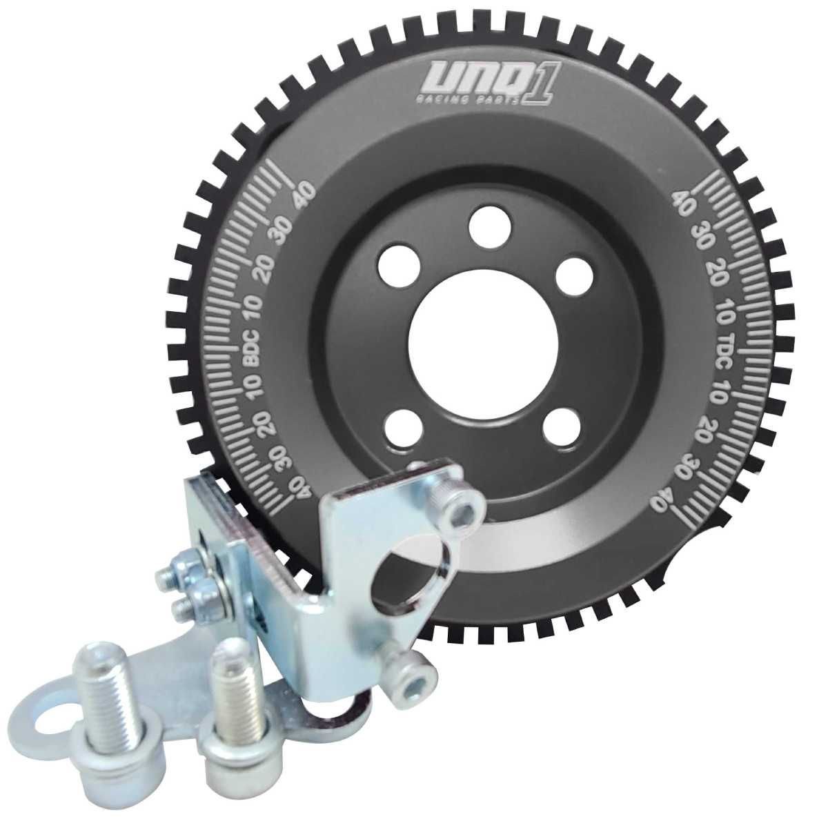 A RODA FONICA UNIQUE1 CONSISTE DE UMA POLIA DE ALUMÍNIO 6061 T6 COM 100MM DE DIÂMETRO ANODAZDA E GRADUAÇÃO FUNCIONAL; UMA ENGRENAGEM DE AÇO 1020 DISPONDO DE 60-2 DENTES CORTDOAS A LASER E UM SUPORTE DO SENSOR DE ROTAÇÃO EM AÇO.