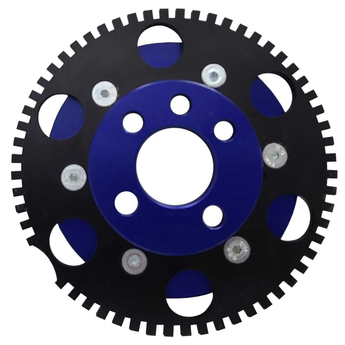 A RODA FONICA UNIQUE1 CONSISTE DE UMA POLIA DE ALUMÍNIO 6061 T6 USINADA EM TORNO CNC E ACABAMENTO ANODZADO, UMA ENGRENAGEM DE AÇO 1020 CORTADA A LASER DISPONDO DE 60-2 DENTES E UM SUPORTE DO SENSOR DE ROTAÇÃO EM AÇO.
