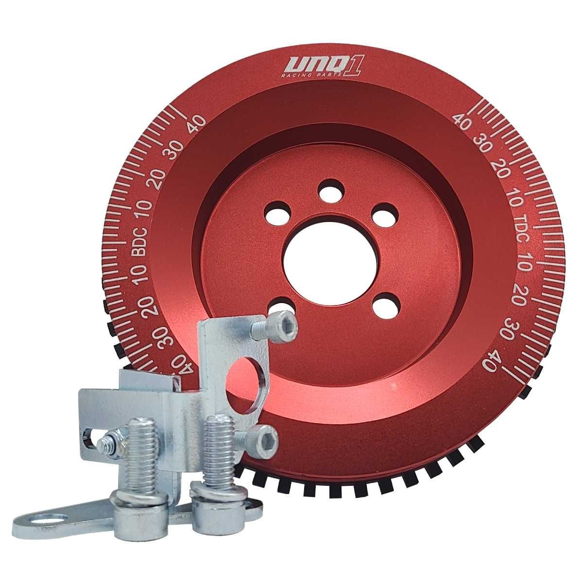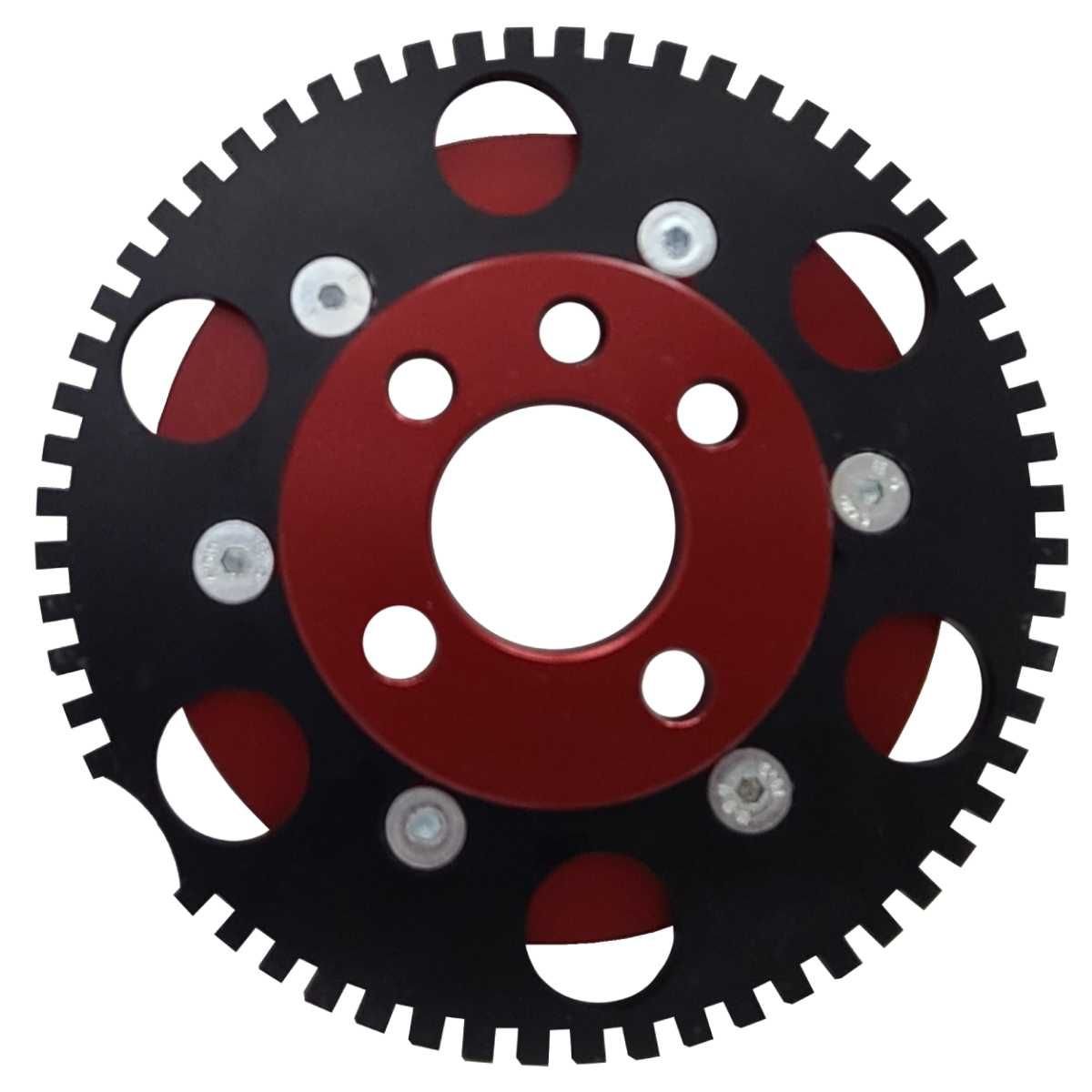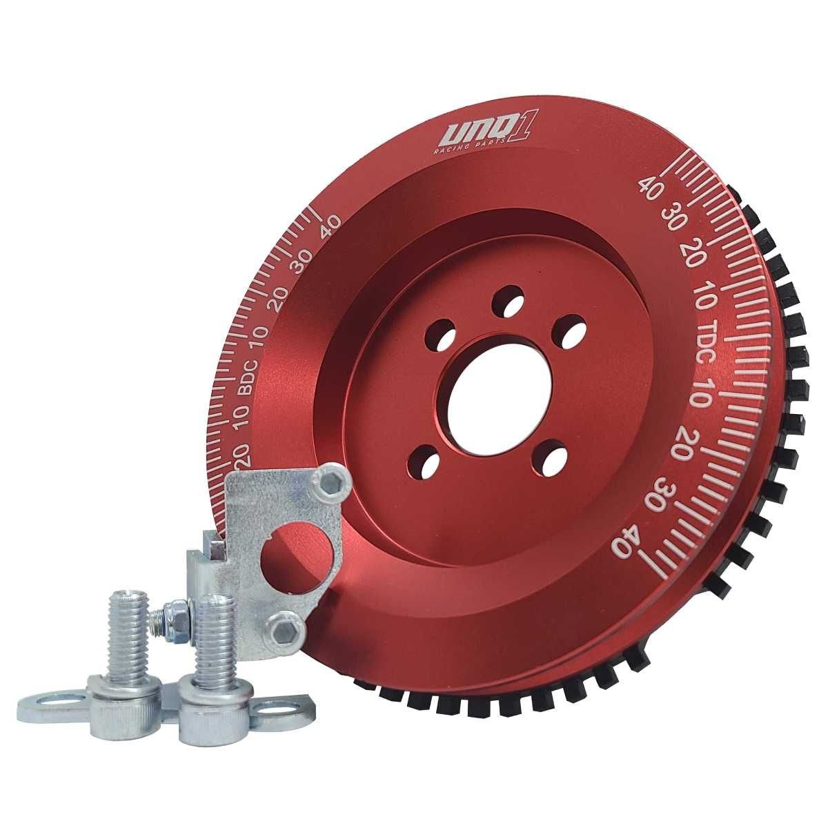 A RODA FONICA UNIQUE1 CONSISTE DE UMA POLIA DE ALUMÍNIO 6061 T6 USINADA EM TORNO CNC E ACABAMENTO ANODZADO, UMA ENGRENAGEM DE AÇO 1020 CORTADA A LASER DISPONDO DE 60-2 DENTES E UM SUPORTE DO SENSOR DE ROTAÇÃO EM AÇO.