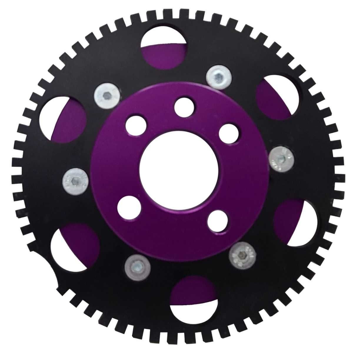 A RODA FONICA UNIQUE1 CONSISTE DE UMA POLIA DE ALUMÍNIO 6061 T6 USINADA EM TORNO CNC E ACABAMENTO ANODZADO, UMA ENGRENAGEM DE AÇO 1020 CORTADA A LASER DISPONDO DE 60-2 DENTES E UM SUPORTE DO SENSOR DE ROTAÇÃO EM AÇO.