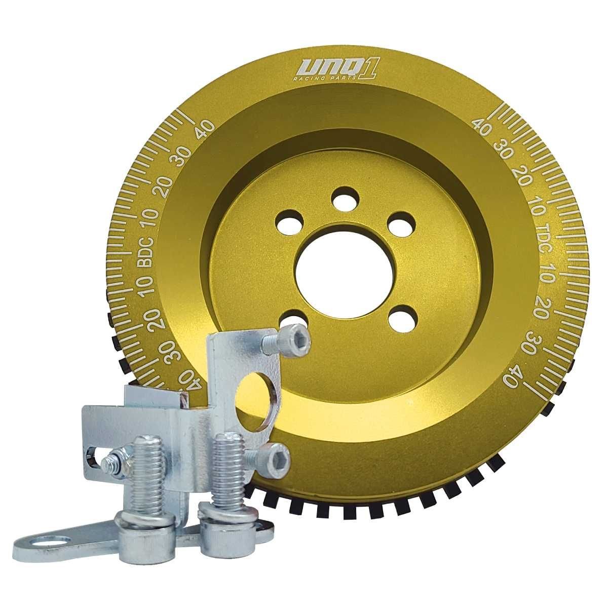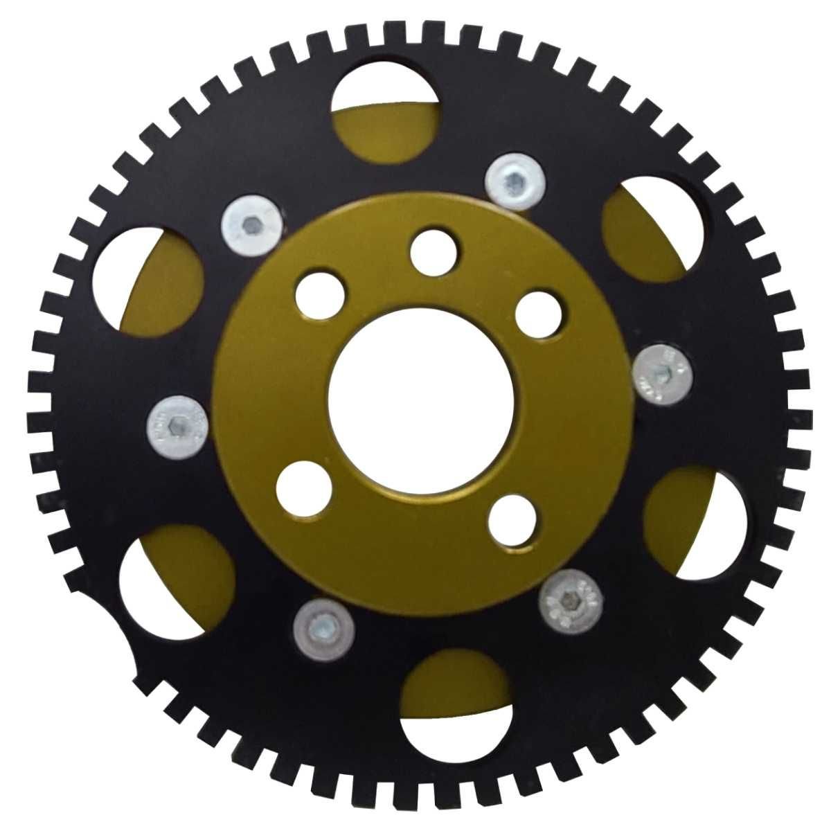 A RODA FONICA UNIQUE1 CONSISTE DE UMA POLIA DE ALUMÍNIO 6061 T6 USINADA EM TORNO CNC E ACABAMENTO ANODZADO, UMA ENGRENAGEM DE AÇO 1020 CORTADA A LASER DISPONDO DE 60-2 DENTES E UM SUPORTE DO SENSOR DE ROTAÇÃO EM AÇO.