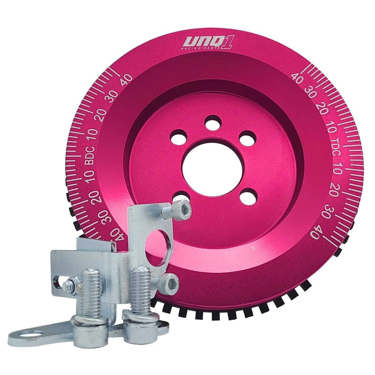 A RODA FONICA UNIQUE1 CONSISTE DE UMA POLIA DE ALUMÍNIO 6061 T6 USINADA EM TORNO CNC E ACABAMENTO ANODZADO, UMA ENGRENAGEM DE AÇO 1020 CORTADA A LASER DISPONDO DE 60-2 DENTES E UM SUPORTE DO SENSOR DE ROTAÇÃO EM AÇO.