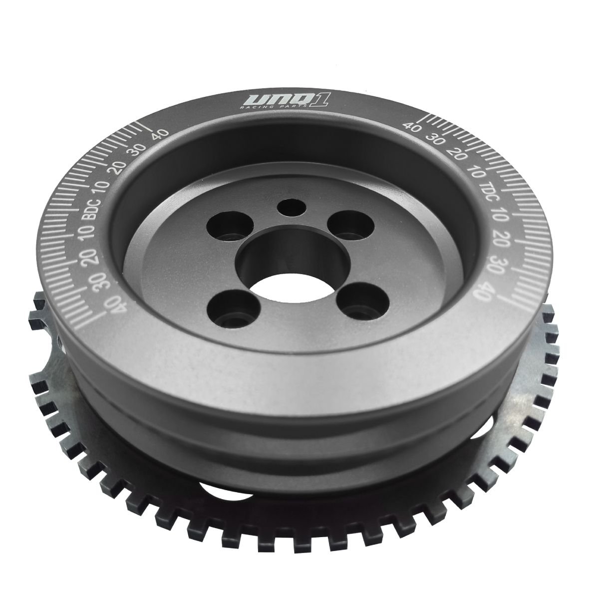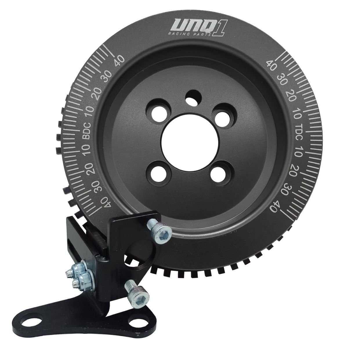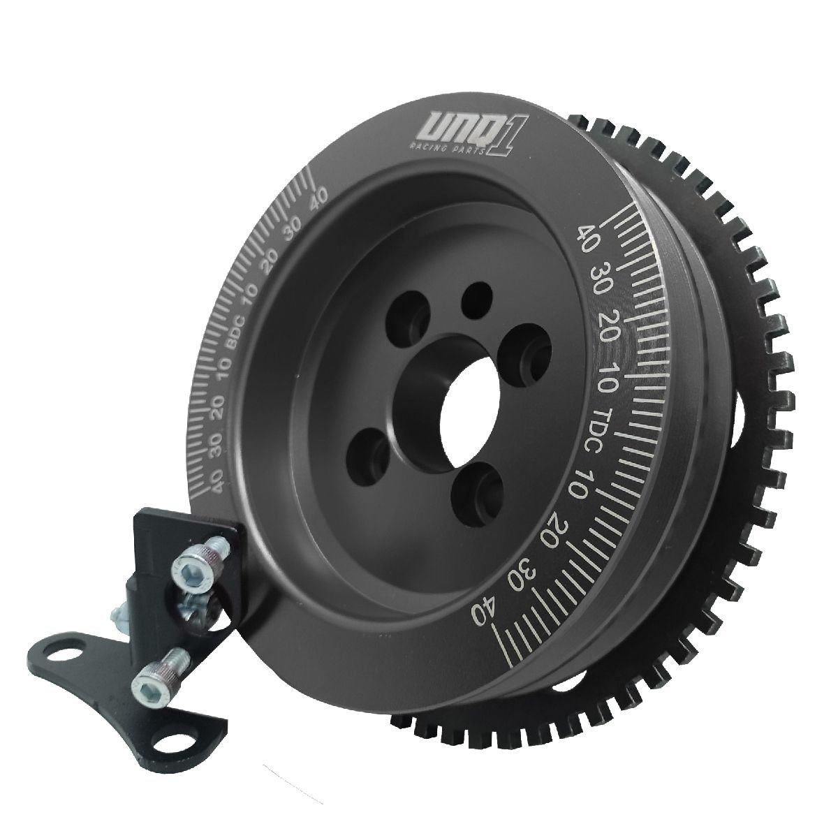 A RODA FONICA UNIQUE1 CONSISTE DE UMA POLIA DE ALUMÍNIO 6061 T6 COM 125MM DE DIÂMETRO, DOIS CANAIS PARA CORREIAS SIMPLES V, ACABAMENTO ANODZADO E GRADUAÇÃO GRAVADA A LASER; UMA ENGRENAGEM DE AÇO 1020 DISPONDO DE 60-2 DENTES CORTADOS A LASER E UM SUPORTE DO SENSOR DE ROTAÇÃO EM AÇO.