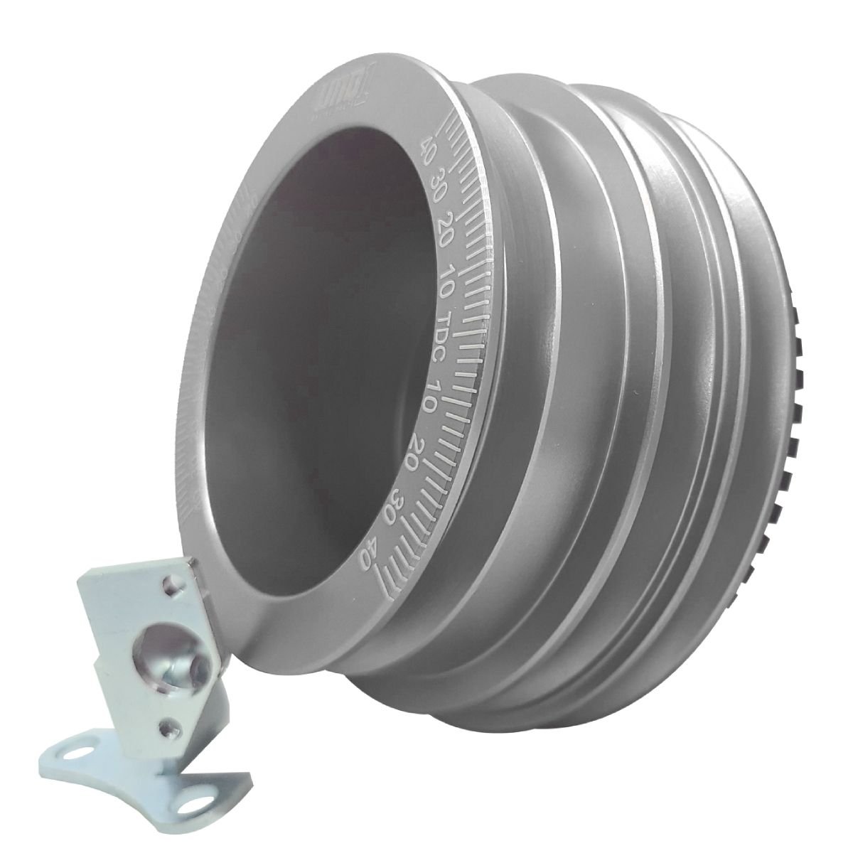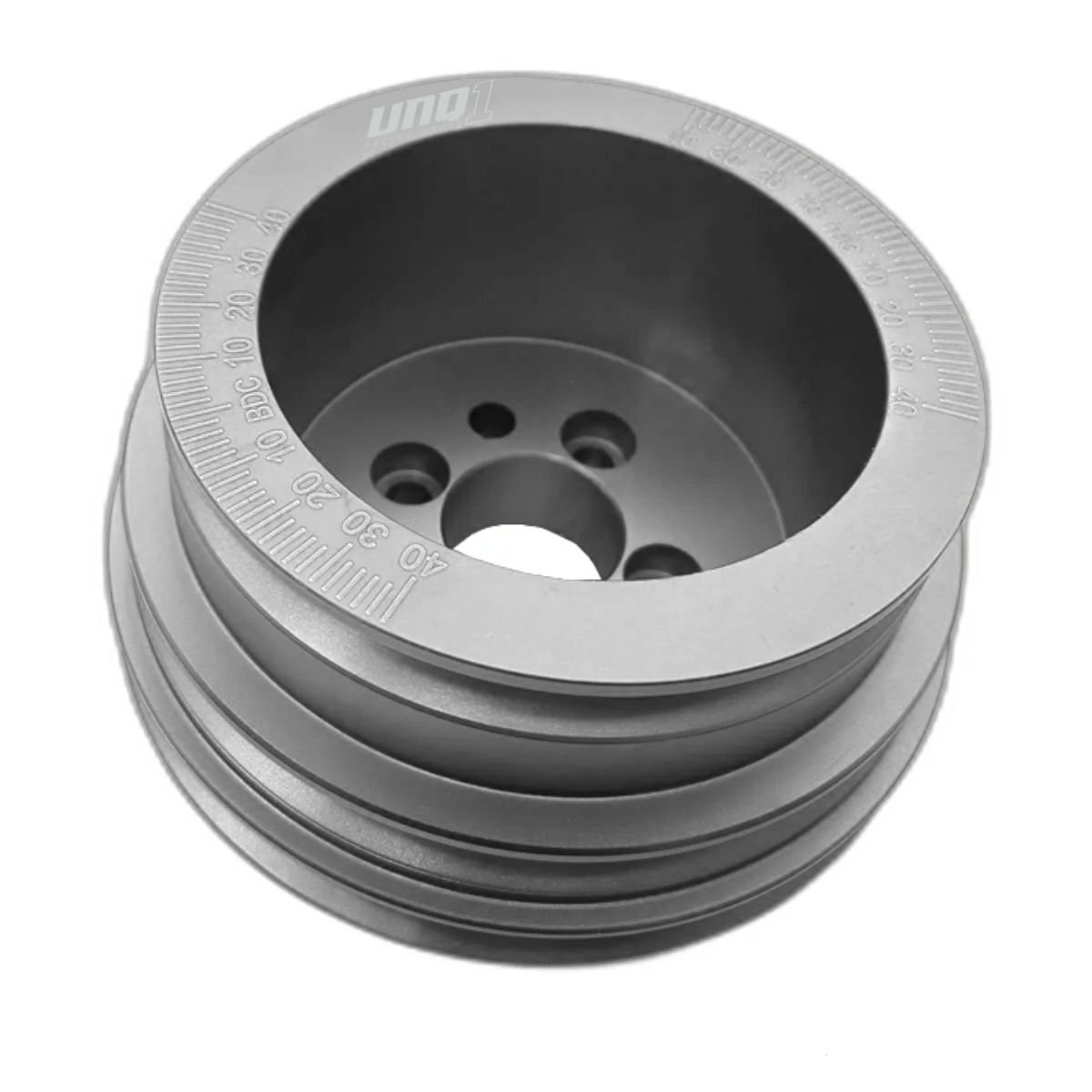 A RODA FONICA UNIQUE1 CONSISTE DE UMA POLIA DE ALUMÍNIO 6061 T6 USINADA EM TORNO CNC E ACABAMENTO ANODZADO, UMA ENGRENAGEM DE AÇO 1020 CORTADA A LASER DISPONDO DE 60-2 DENTES E UM SUPORTE DO SENSOR DE ROTAÇÃO EM AÇO.