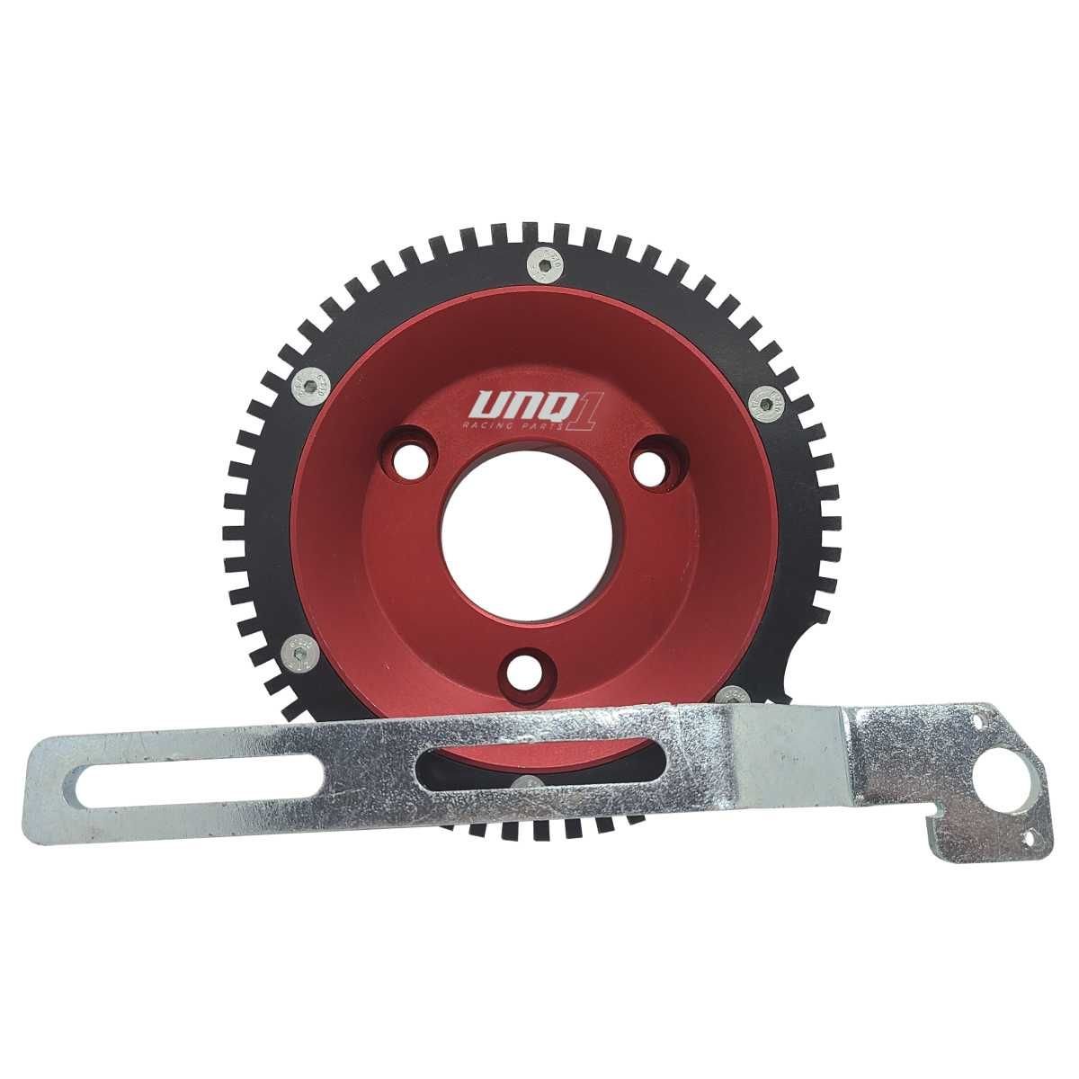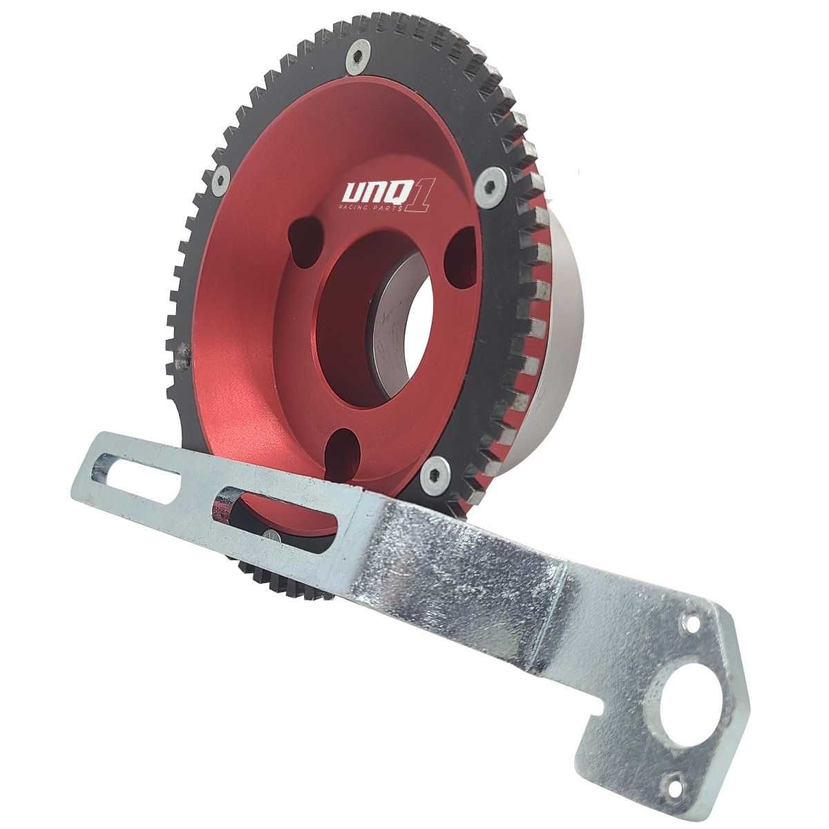 A RODA FONICA UNIQUE1 CONSISTE DE UMA POLIA DE ALUMÍNIO 6061 T6 COM 2 CANAIS (VEICULOS COM AR CONDICIONADO) USINADA EM TORNO CNC E ACABAMENTO ANODZADO, UMA ENGRENAGEM DE AÇO 1020 DISPONDO DE 60-2 DENTES CORTADA A LASER, UM SUPORTE DO SENSOR DE ROTAÇÃO EM AÇO E UM ESPAÇADOR DE ALUMÍNIO.