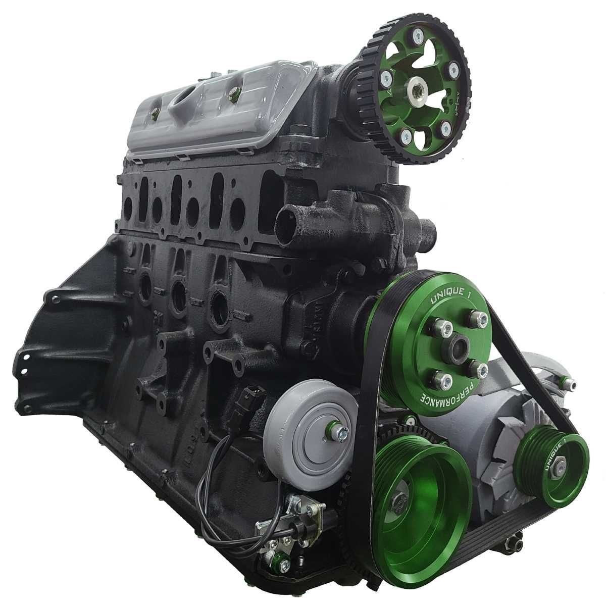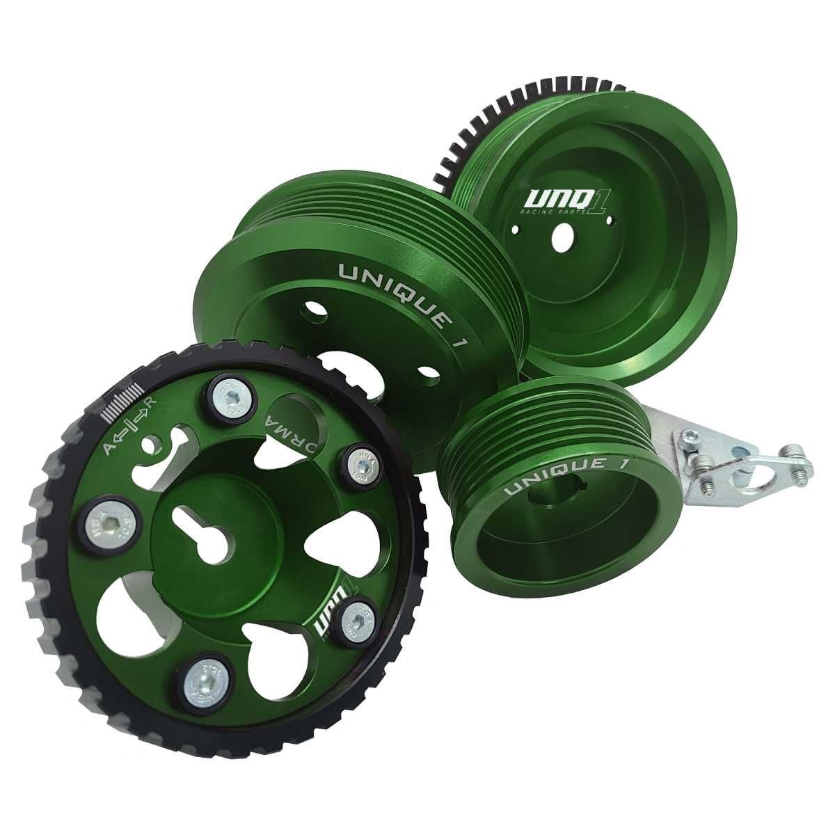 - UMA RODA FONICA QUE CONSISTE DE UMA POLIA DE ALUMÍNIO BILLET E ACABAMENTO ANODZADO COM GRADUAÇÃO FUNCIONAL GRAVADA A LASER, UMA ENGRENAGEM DE AÇO 1020 CORTADA A LASER DISPONDO DE 60-2 DENTES E UM SUPORTE DO SENSOR DE ROTAÇÃO EM AÇO.