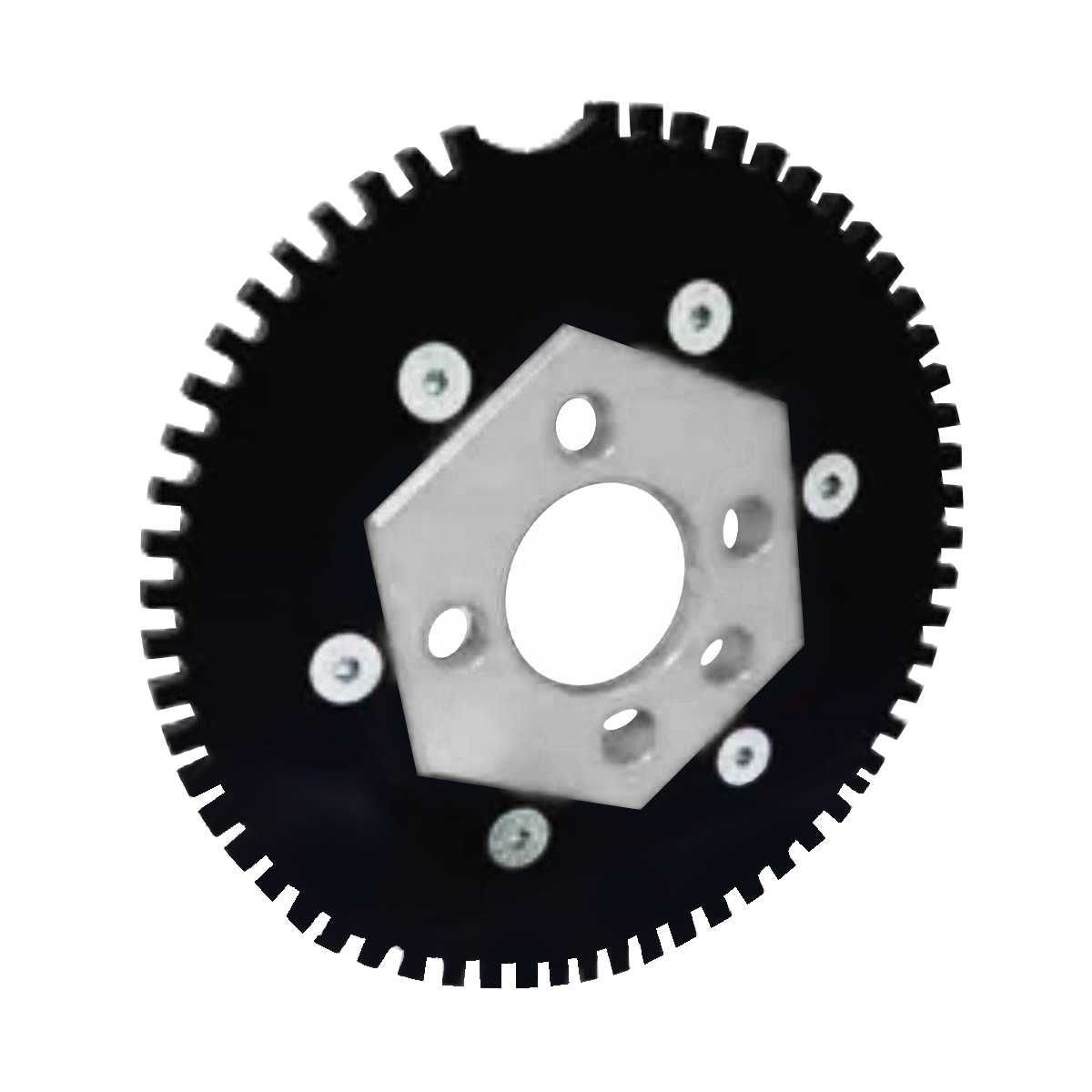 POLIA DA RODA FONICA FABRICADA EM ALUMÍNIO 6061 T6 COM 100MM DE DIÂMETRO, ACABAMENTO ANODZADO, GRADUAÇÃO E ACOPLAMENTO NA ENGRENAGEM SEXTAVADO; ENGRENAGEM FABRICADA EM AÇO 1021 DISPONDO DE 60-2 DENTES DORTADOS A LASER E SUPORTE DO SENSOR DE ROTAÇÃO EM AÇO.