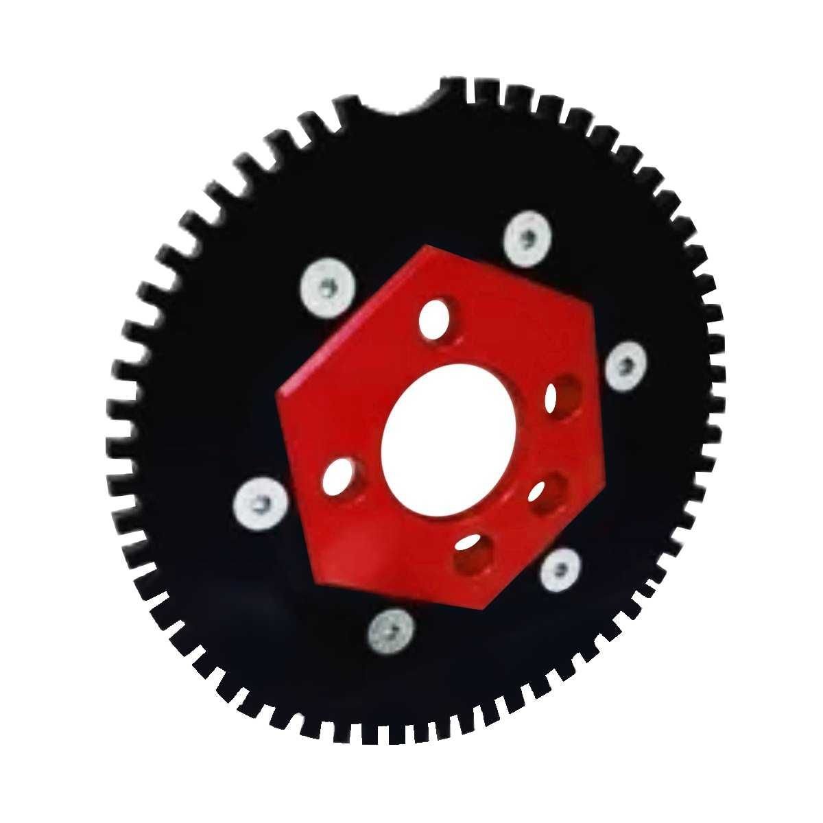 POLIA DA RODA FONICA FABRICADA EM ALUMÍNIO 6061 T6 COM 100MM DE DIÂMETRO, ACABAMENTO ANODZADO, GRADUAÇÃO E ACOPLAMENTO NA ENGRENAGEM SEXTAVADO; ENGRENAGEM FABRICADA EM AÇO 1021 DISPONDO DE 60-2 DENTES DORTADOS A LASER E SUPORTE DO SENSOR DE ROTAÇÃO EM AÇO.