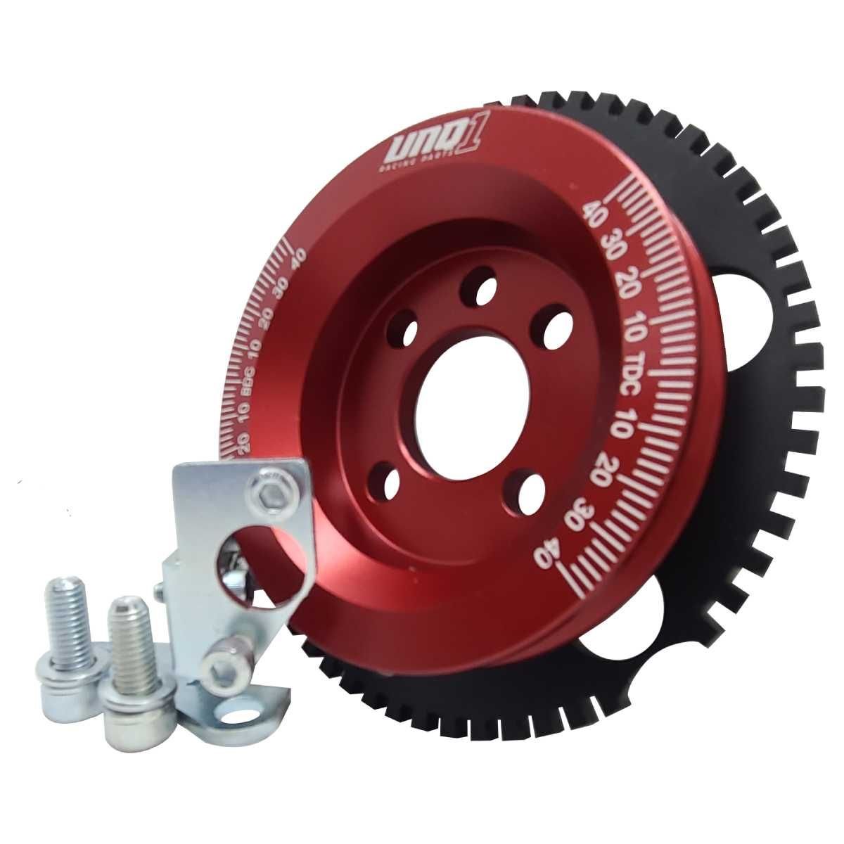 A RODA FONICA UNIQUE1 CONSISTE DE UMA POLIA DE ALUMÍNIO 6061 T6, UMA ENGRENAGEM DE AÇO 1020 E O SUPORTE DO SENSOR. O SENSOR É UM DISPOSITIVO ELETRÔNICO QUE MONITORA A POSIÇÃO OU VELOCIDADE DE ROTAÇÃO DO VIRABREQUIM. ESSAS INFORMAÇÕES SÃO USADAS PELOS SISTEMAS DE GERENCIAMENTO DO MOTOR PARA CONTROLAR A INJEÇÃO DE COMBUSTÍVEL, TEMPO DO SISTEMA DE IGNIÇÃO OU OUTROS PARAMETROS.