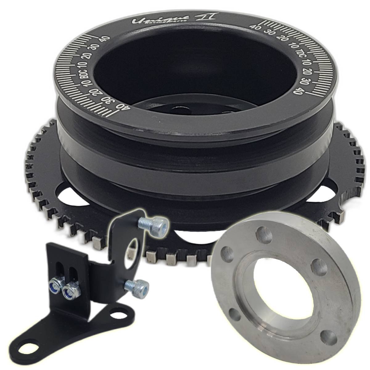 A RODA FONICA UNIQUE1 CONSISTE DE UMA POLIA DE ALUMÍNIO 6061 T6, UMA ENGRENAGEM DE AÇO 1020 E O SUPORTE DO SENSOR. O SENSOR É UM DISPOSITIVO ELETRÔNICO QUE MONITORA A POSIÇÃO OU VELOCIDADE DE ROTAÇÃO DO VIRABREQUIM. ESSAS INFORMAÇÕES SÃO USADAS PELOS SISTEMAS DE GERENCIAMENTO DO MOTOR PARA CONTROLAR A INJEÇÃO DE COMBUSTÍVEL, TEMPO DO SISTEMA DE IGNIÇÃO OU OUTROS PARAMETROS.